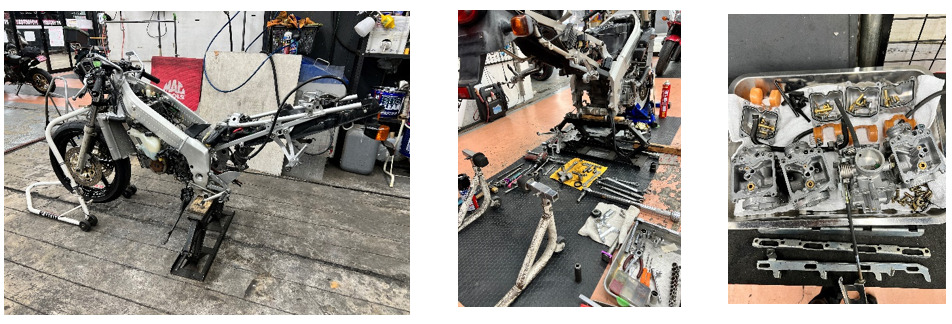 車両入庫時に時間をかけて約90項目※ にわたる点検、必要な整備、調整、修理を徹底して行い、契約から納車までの時間を可能な限り短縮します。キャブレターや前後のサスペンション、ステアリングステム、リアスイングアーム、その他足周りはフレームとエンジンだけの状態になるまで全て分解しています。