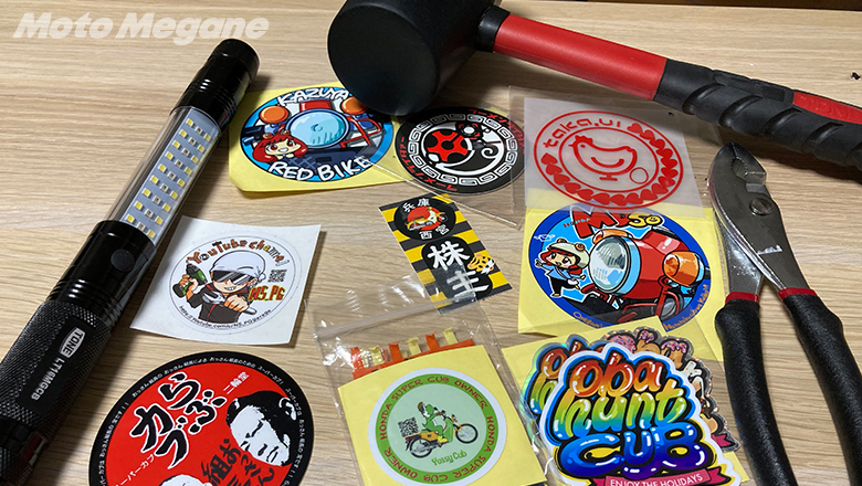 こちらはミーティング会場でいただいたカブオーナーのステッカーたち。撮影してたら声かけていただきまして、自分のステッカーと交換しました。そして出店されてた「TONE」さんから買いました「ゴムハンマー」「プライヤー」「LED作業ライト」です。