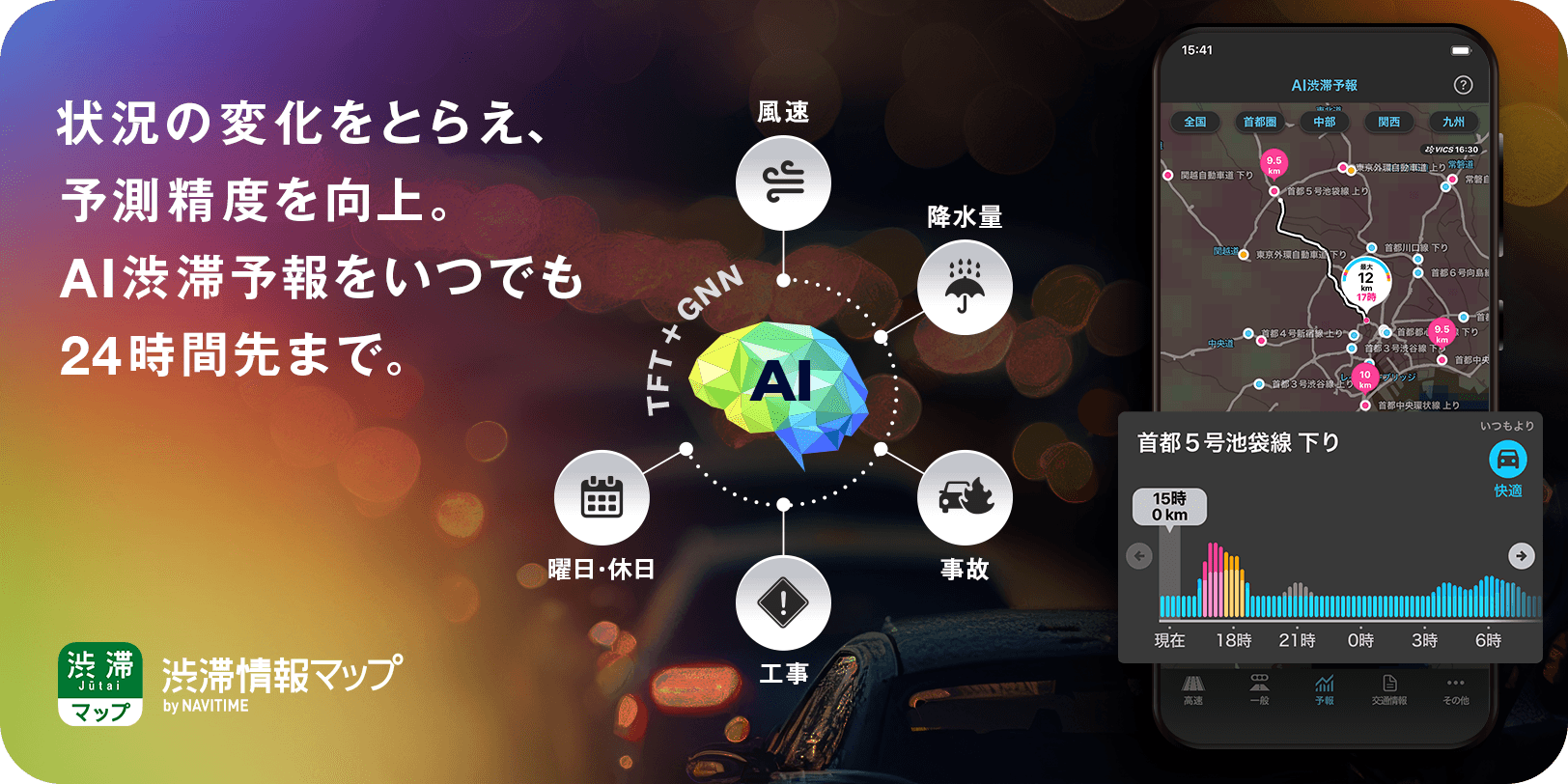 株式会社ナビタイムジャパン(代表取締役社長:大西啓介、本社:東京都港区)のリアルタイムの道路交通情報に特化したアプリ『渋滞情報マップby NAVITIME』にて提供中の「AI渋滞予報」は、2023年8月8日(火)より、新渋滞予測モデルの採用により、事故や工事による交通規制情報や天気予報情報を考慮した渋滞予測が可能となりました。また、渋滞予報の更新タイミングも、今までは朝7時時点の1日1回でしたが、いつでも最大24時間先までの渋滞予報を確認できるようになります。