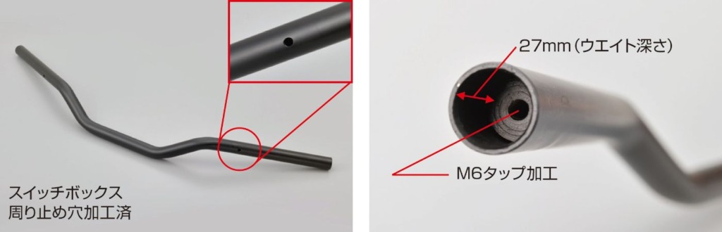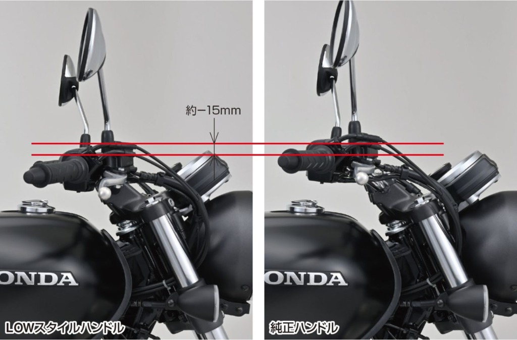 純正ハンドルよりグリップ位置を15mm低く、若干手前内側に絞ることで生まれる程よい前傾姿勢がスポーティなLOWスタイルハンドル。エンド部には6mmネジ穴加工済みなので、純正のバーエンドの他にM6サイズのバーエンドミラーアダプターが装着可能だ。