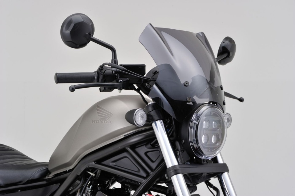 デイトナは他にもレブル250/500用に、Aerovisor(エアロバイザー)シリーズの取り扱いも行っている。こちらはすでに販売中商品で、ブラストバリアーに比べてシャープな作りが特徴だ。
