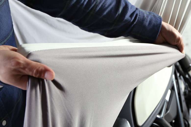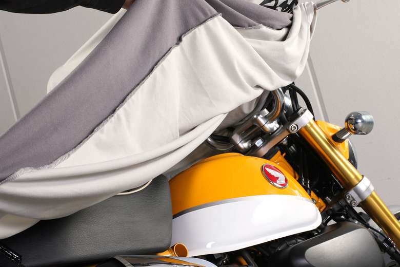 バイクの複雑な形状にフィットし、削り出しステップなどの突起にも強い高強度ストレッチ素材。斜めはもちろん、縦横にも伸びるため、ハンドルをフルロックした状態でもカバーすることができる。愛車の外装を守りつつカバーをフィットさせるため、開口部は160%の有効伸縮率を持たせてある。