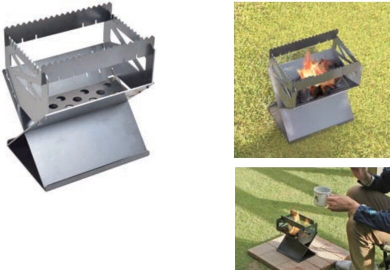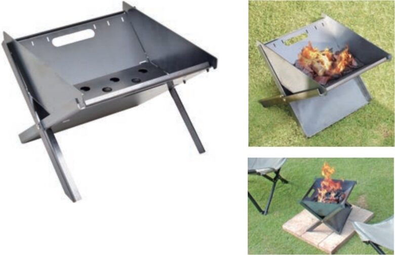 折りたたんで収納することが可能で、パッキング時に重宝すること間違いなし。メイドインジャパンなので、品質も充分となっている。またソロキャン向けのファイヤーピット ソロ用には、オプションで同じ黒皮鉄製の鉄板も用意されているため、グリルとしても使える。