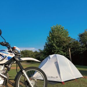 キャンプツーリング用テントで一番大切なのは収納サイズがコンパクトであること。ヘルメットやブーツ、ウェアなど荷物の多いライダーにとって適度に広く快適な居住スペースがあることに加え、説明書を見なくても感覚的に設営できるくらいすべてが簡単であることも大切。