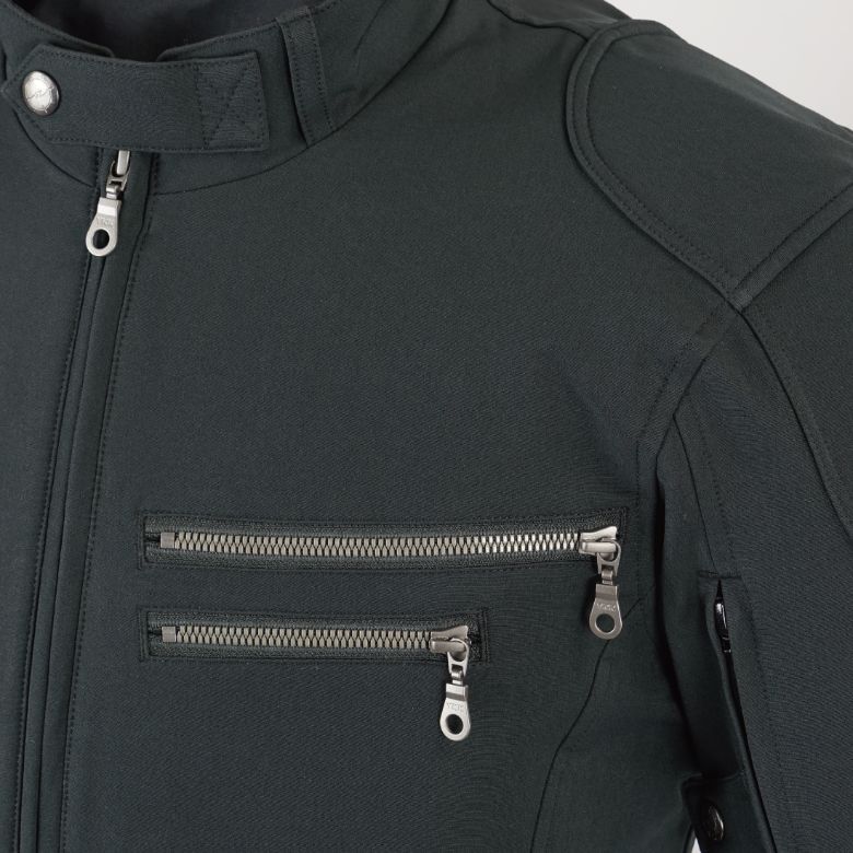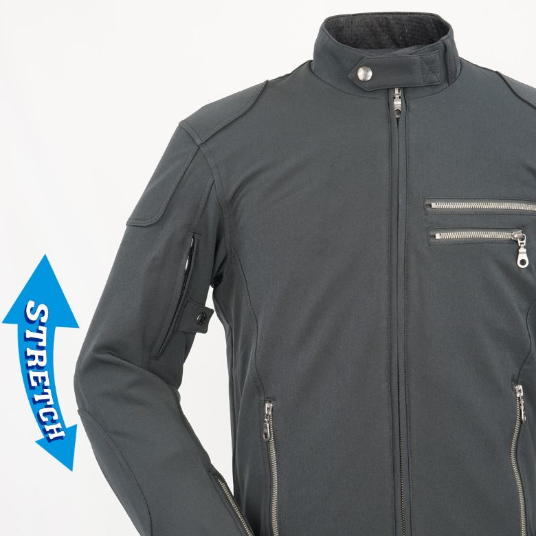 柔らかい着心地とストレッチ性のある、ほどよい通気性を備えたソフトシェルを採用したビンテージライディングジャケット