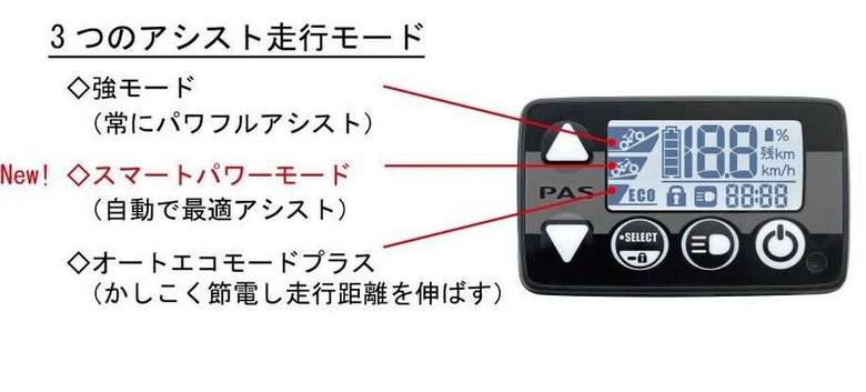 今回追加された「スマートパワーモード」は、走行中の運転者の動き(自転車のペダルを漕ぐ力やペダルを回す速さ)や路面の状況から、最適なアシストパワーを自動で制御します。急な坂道や荷物積載時などアシストパワーが必要なシーンではパワフルにアシストし、アシストの必要性が低くなる平坦路や下り坂ではアシストパワーをセーブする。走行中に「強」モードへの切り替え操作を行わなくても、常に自動で最適なアシスト力が提供されるため、手間要らずで、非常に使い勝手に優れた走行モードである。電動アシスト自転車に初めて乗る方や、より運転に集中したい方などにも便利な機能である。