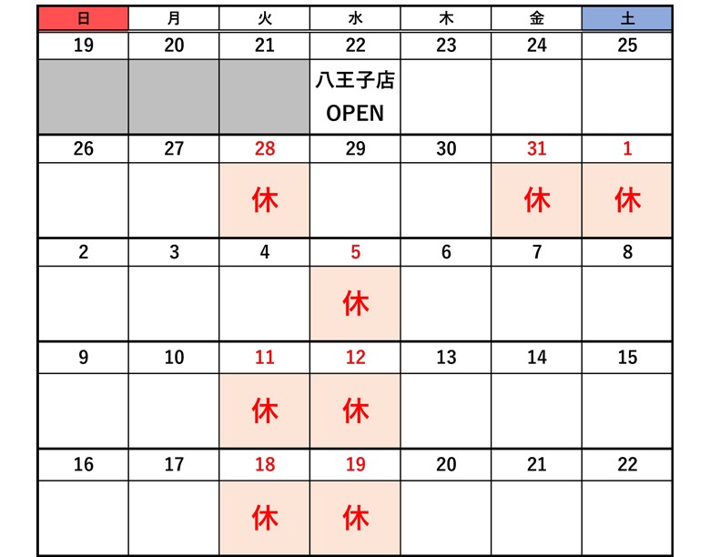 営業日は下記カレンダーを要確認。年末年始の営業に伴い、当面の間、店休日が不規則となっている。来店前に、店休日でないか確認をしよう。