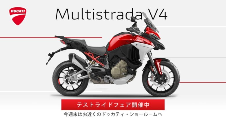ドゥカティジャパン株式会社は8月7日~9月26日までの期間に、全国の正規ディーラー店で、ムルティストラーダ V4の「テストライド・フェア」を開催する。