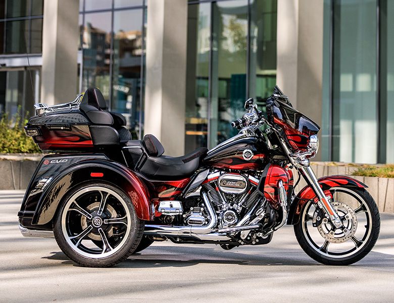 また、トライク(普通自動車MT免許をお持ちであれば大型二輪免許なしでも乗ることのできる三輪モーターサイクル)唯一のCVOが「CVO トライグライド」。3つの車輪がある安心感を提供するスーパープレミアムなトライクには、ダンテスレッドフェイドが新カラーとして登場することとなった。