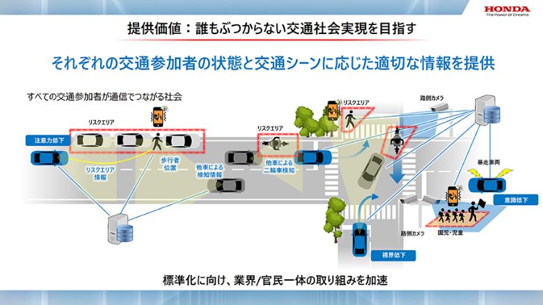 Hondaは、誰もが事故に遭わない交通社会の実現に向け、通信技術の活用により、全ての交通参加者がつながり、共存できる「協調安全社会」の実現を目指していく。
