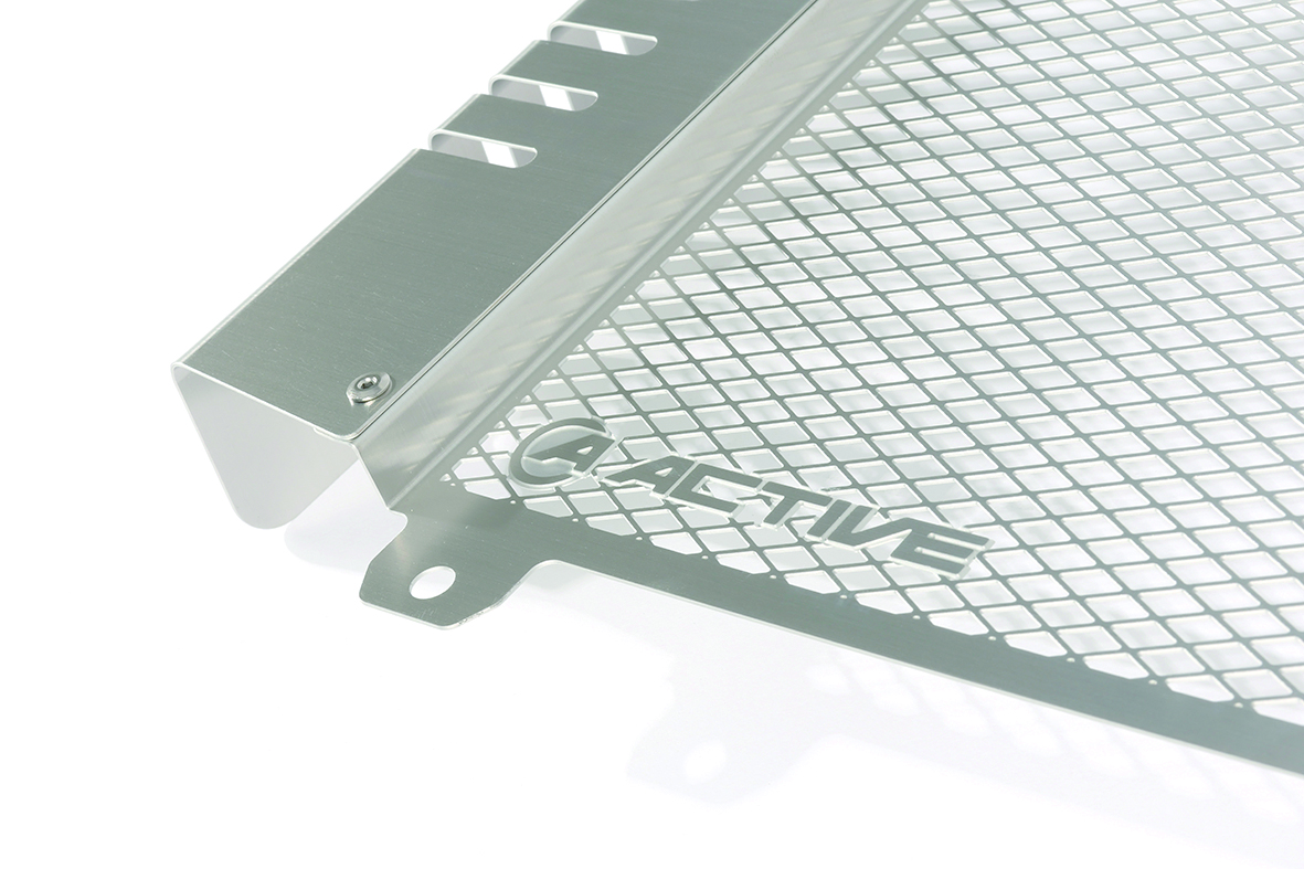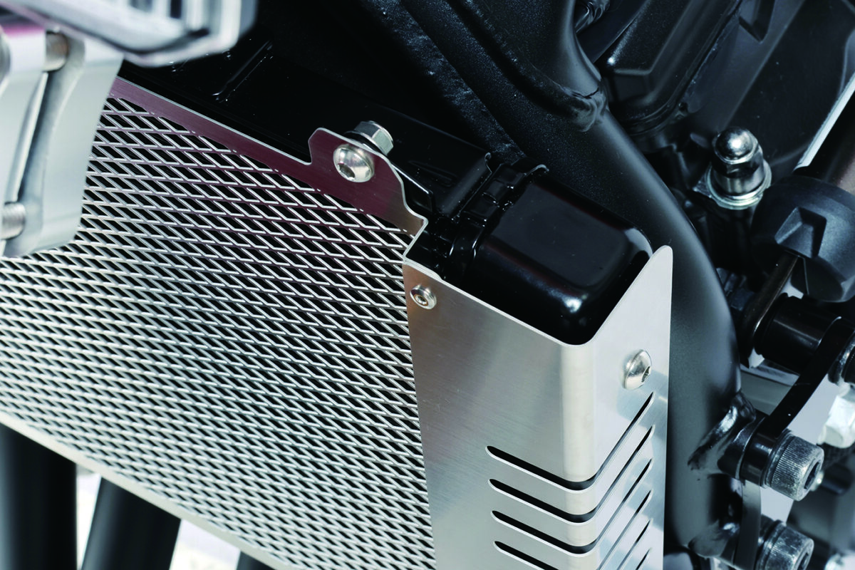 トラディショナルネイキッドに似合う、機能美を兼ね備えたラジエターガード。フィン変形による冷却効率低下やラジエターの破損を防ぐ機構。サイドタンクのカバーと一体型で、コアに添わせた形状です。