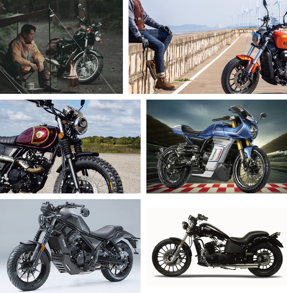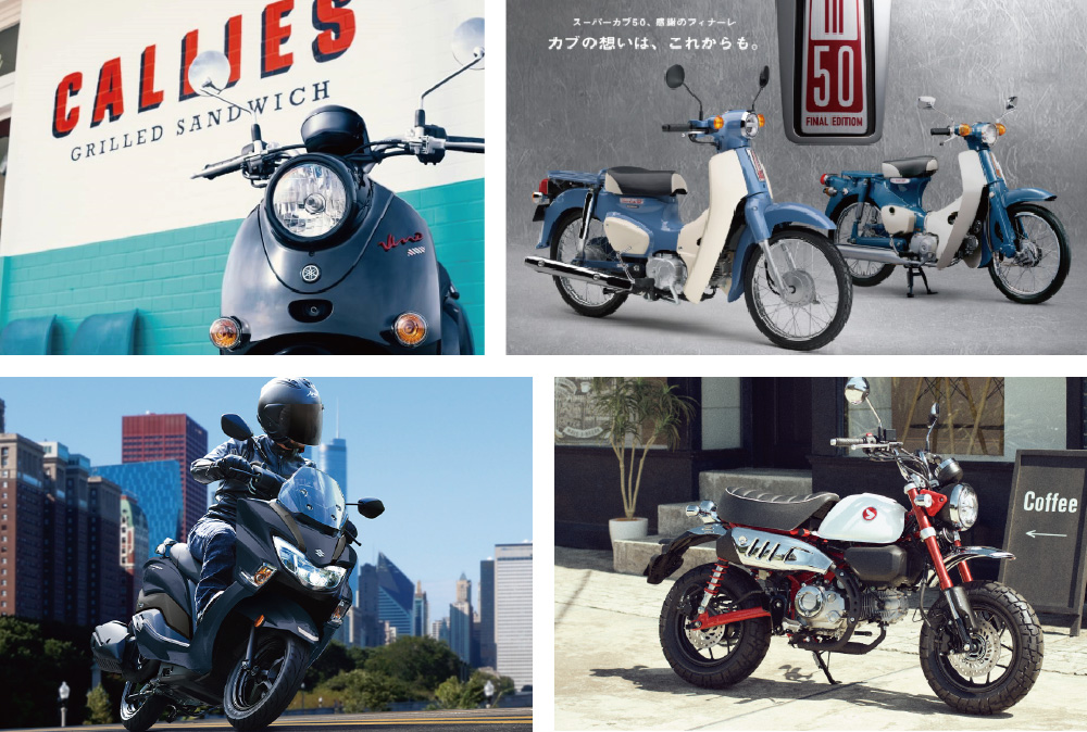 原付1種(50cc)や原付2種(51~125cc)バイクの新車・優良中古車を多数展示。国産メーカーはもちろん、イギリスのA・J・SやイタリアのFB.モンディアル、スペインのレオンアートといった海外の人気ブランドでは国産には見られない独自の機構や造形美、その国々で培ったテクノロジーを用いた魅力あふれるモデルが集結。