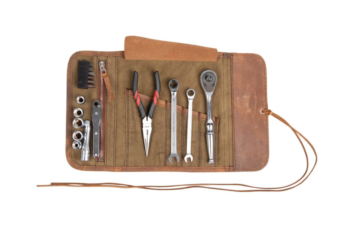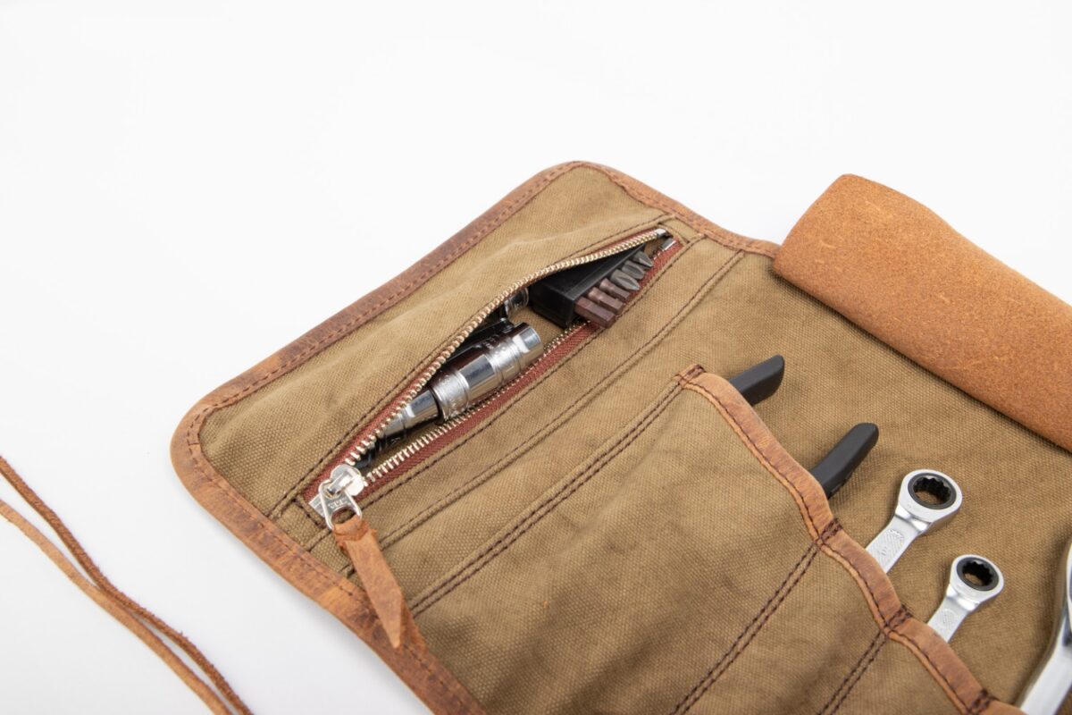同製品は、レンチやラチェットなどを整理して収納できる巻き取り式ツールケースで、落下防止カバーや小物用ポケットを備える点が特徴だ。素材にはワックス加工コットンとオイルレザーを採用し、使い込むことで風合いの変化も楽しめる。サイズは縦23×横39cm、カラーはヴィンテージブラウンで、価格は7,920円(税込)となる。