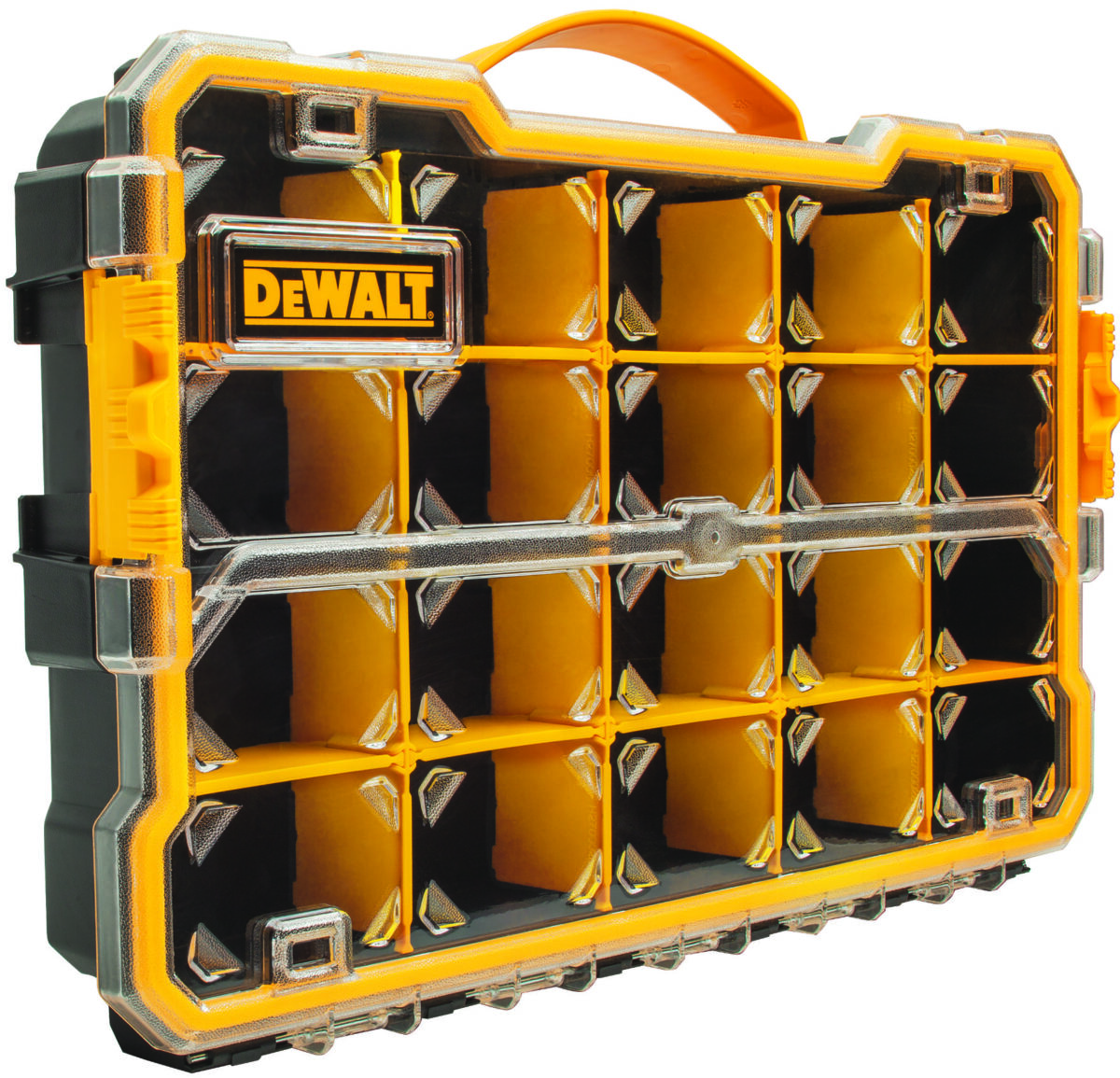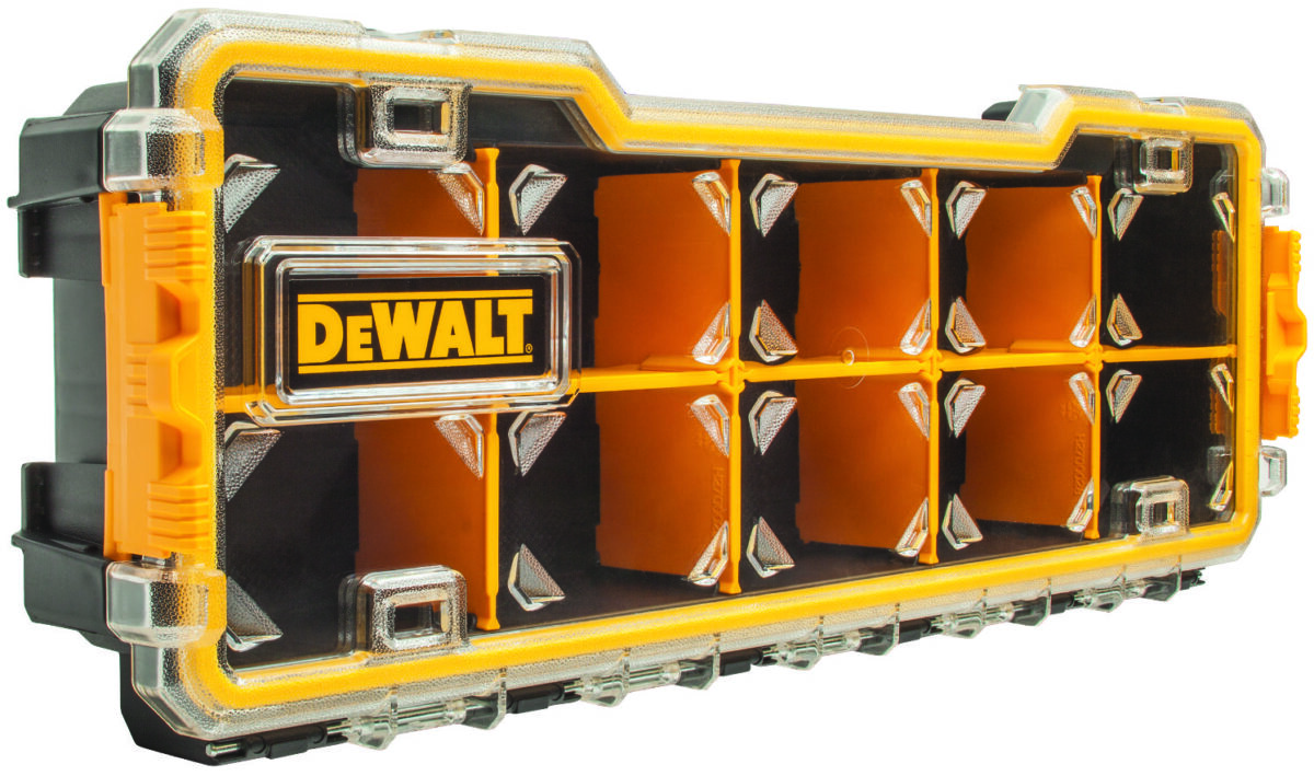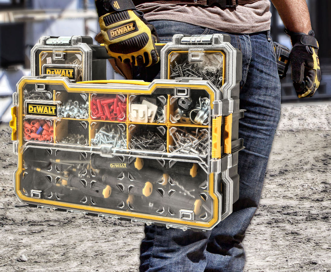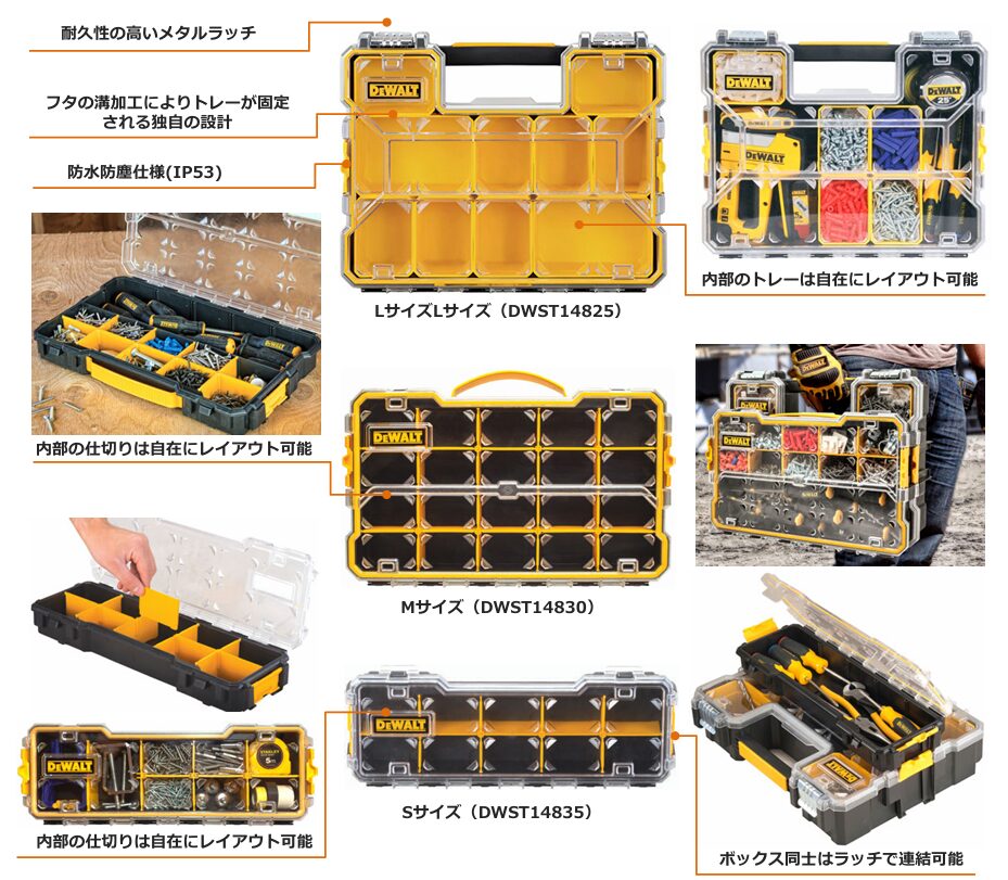 リリースされるのは、L(品番︓DWST14825)、M(品番︓DWST14830)、S(品番︓DWST14835)の3サイズ。スケルトン仕様のフタは中⾝が⼀⽬でわかる視認性に優れるほか、内部の仕切りやトレーがしっかりと固定される独⾃の設計により、収納物のサイズや形状に合わせて⾃在にレアウトすることができます。パーツや⼩物類のほか、各種電動ツールやハンドツール、アウトドア、趣味やレジャー⽤品など幅広いジャンルの整理収納に活⽤いただけます。