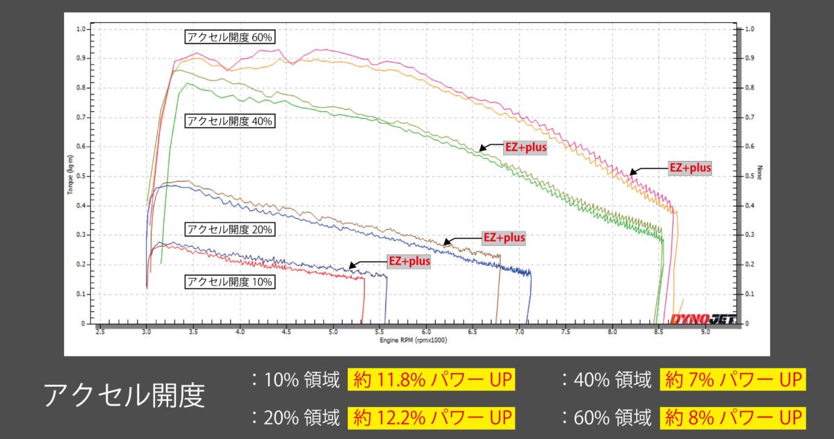 EZ+plus を取り付けた場合、本来のバイクの性能を発揮できるように燃料補正が最適化され、発進~小中開度域でのトルクアップを体感できる。