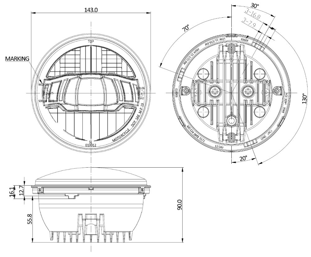 内側には、透明度の高いPMMA(アクリル)製インナーレンズを使用しています。LEDの光をそのまま通すのではなく、屈折や拡散をコントロールする設計で、照射方向や輪郭を精密に整えます。強度はポリカーボネートに劣りますが、インナーは外部からの衝撃を受けにくいため、光学性能を優先した素材選定となっています。