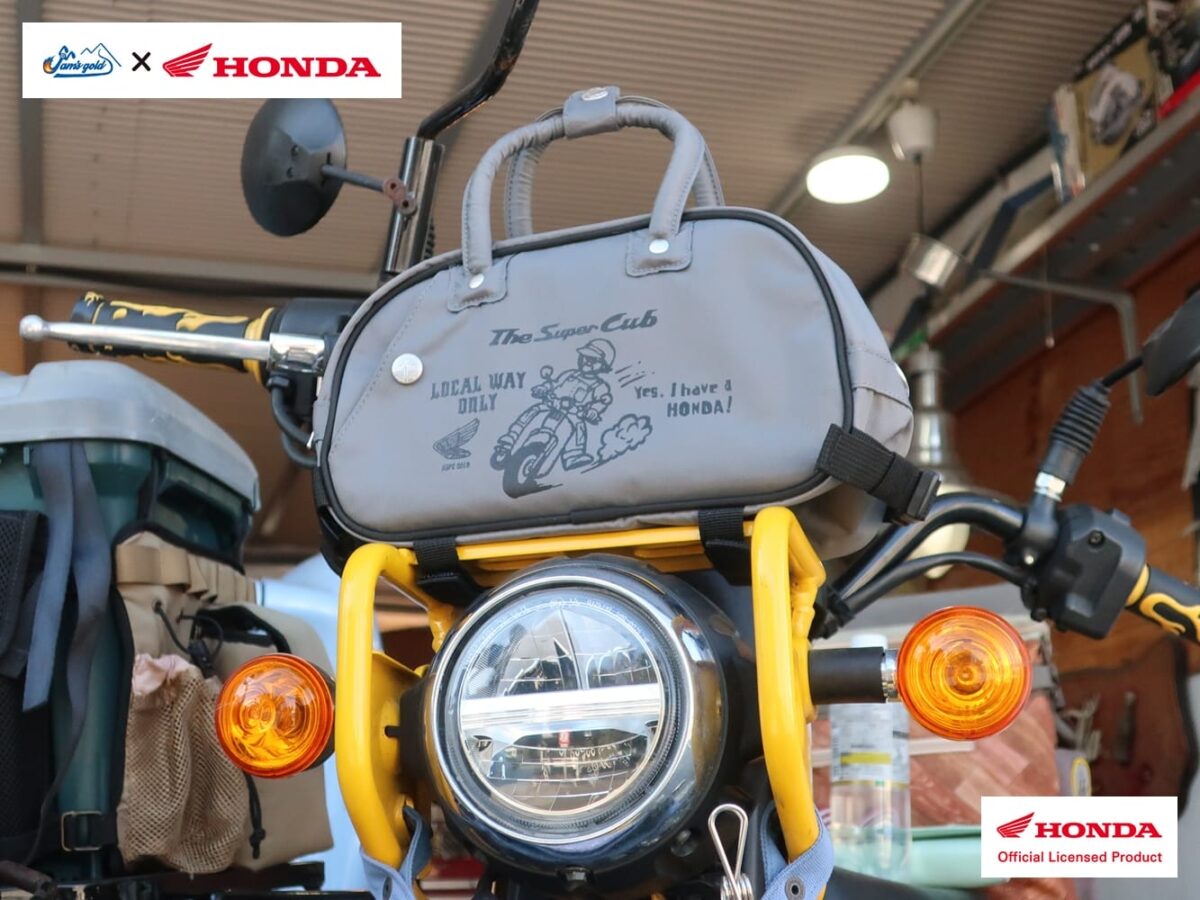 一見普通のト―トバックだがバックルループをハンドルにぶら下げて簡単に取付できるサイクルトートバック。特にカブ乗りに人気のギヤにHondaロゴを落とし込んだ。