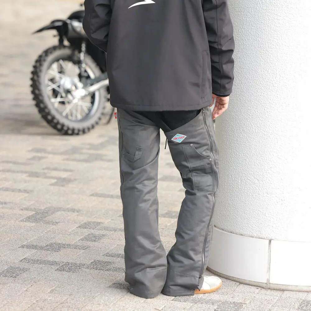 今年で5シーズン目のDEL RIO いわいるレザーチャップスのゴリゴリ感を無くしファッションともマッチングがいいペインターパンツ風おしゃれチャップス フルジップなのでブーツを脱がずに着脱!素材は防風!見た目以上にポカポカだ 重量もなくコンパクトだから携行も楽ちん 少しタイトに履くのがルックスグッドだ!