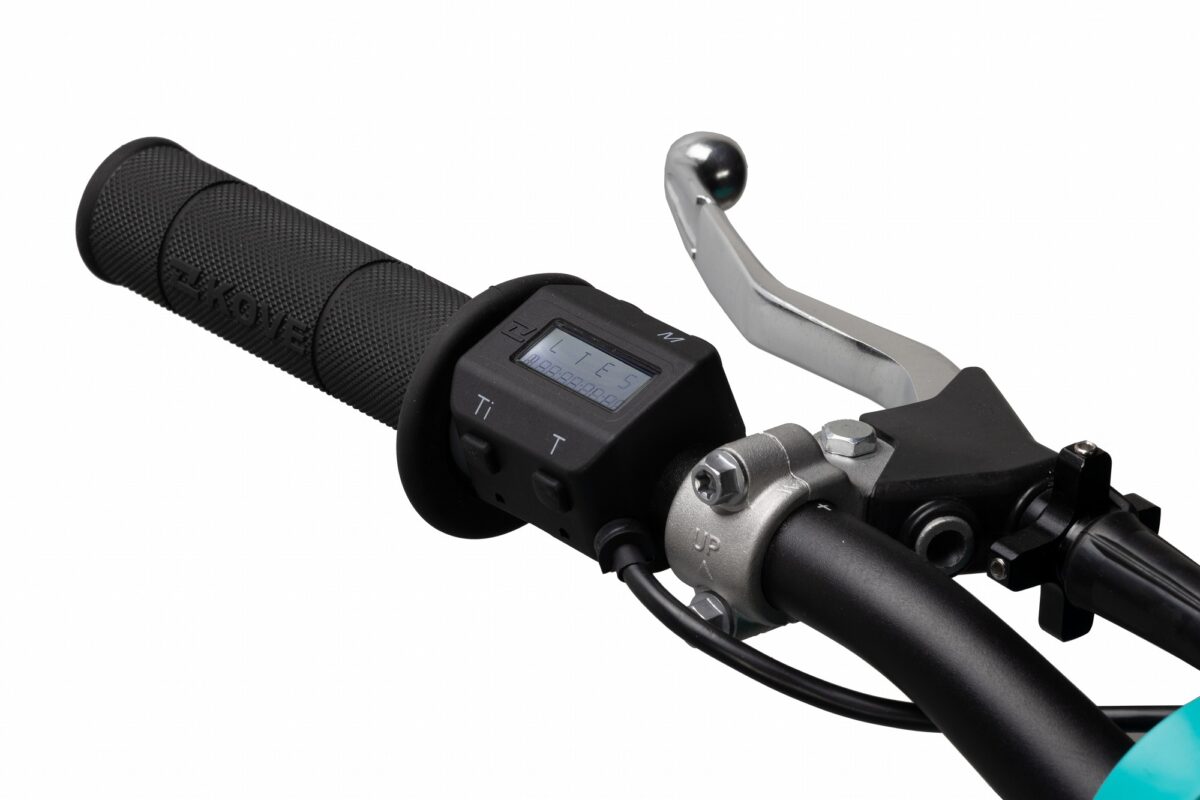 フロント310mm / リア 300mmストローク。フロントフォークはKYB、リアYU-ANサスペンション。ステム&ハンドルポストはアルミ削り出し - パワーモード/タイマー