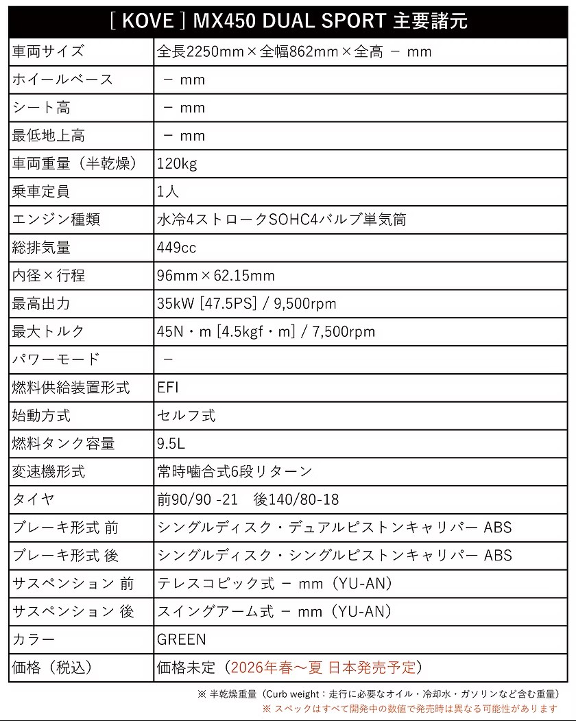 KOVE MX450 DUAL SPORTの現時点で公開可能な情報は以下のHPで確認ができる。