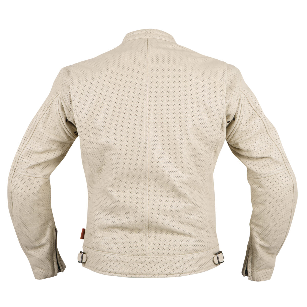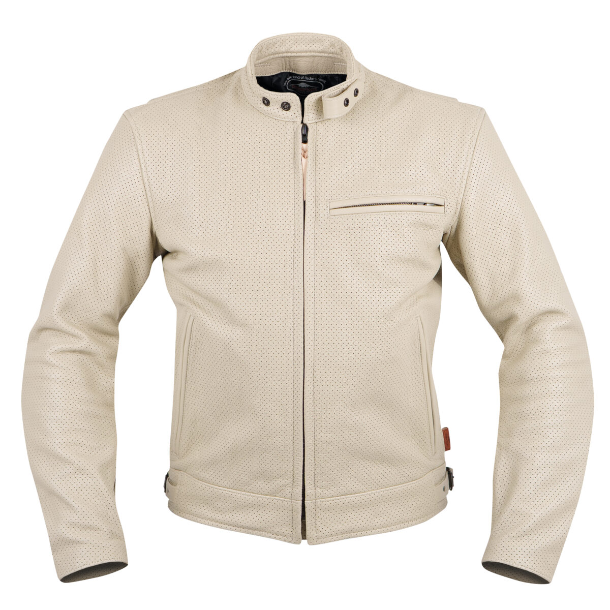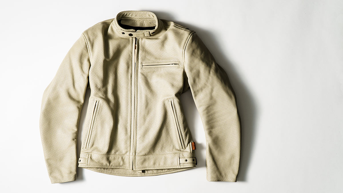 ゴート革を採用し、春夏らしい軽く着心地の良いジャケットに仕上げています。胸と腰のポケットを開けると、エアーインテークとしても機能します。