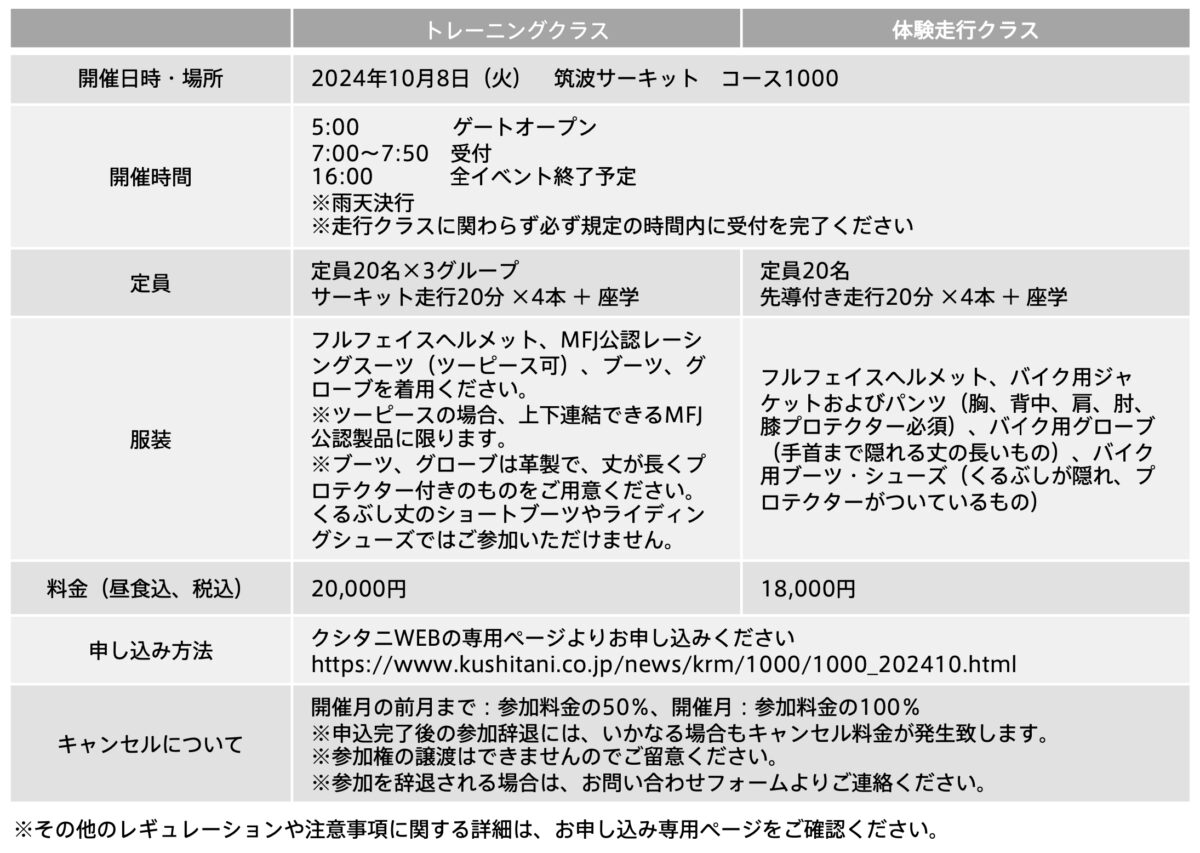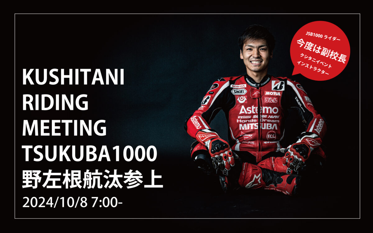 株式会社クシタニは、筑波サーキットコース1000において、高橋裕紀さんと野左根航汰選手をインストラクターに迎えたKUSHITANI RIDING MEETINGを、2024年10月8日(火)に開催すると発表した。