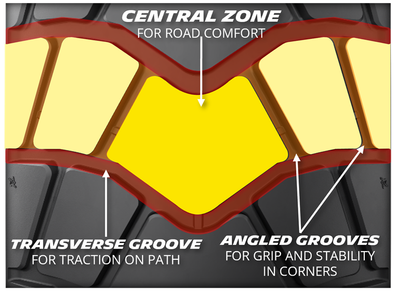 中央部は長寿命、サイド部はコーナリング時に優れたグリップを提供
