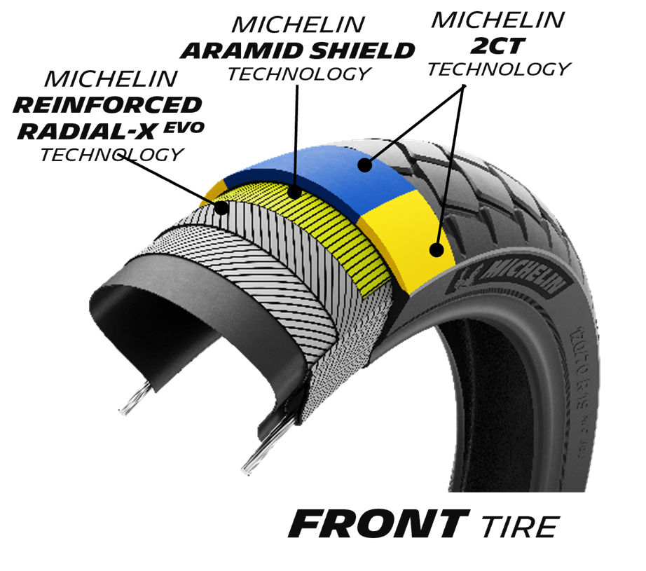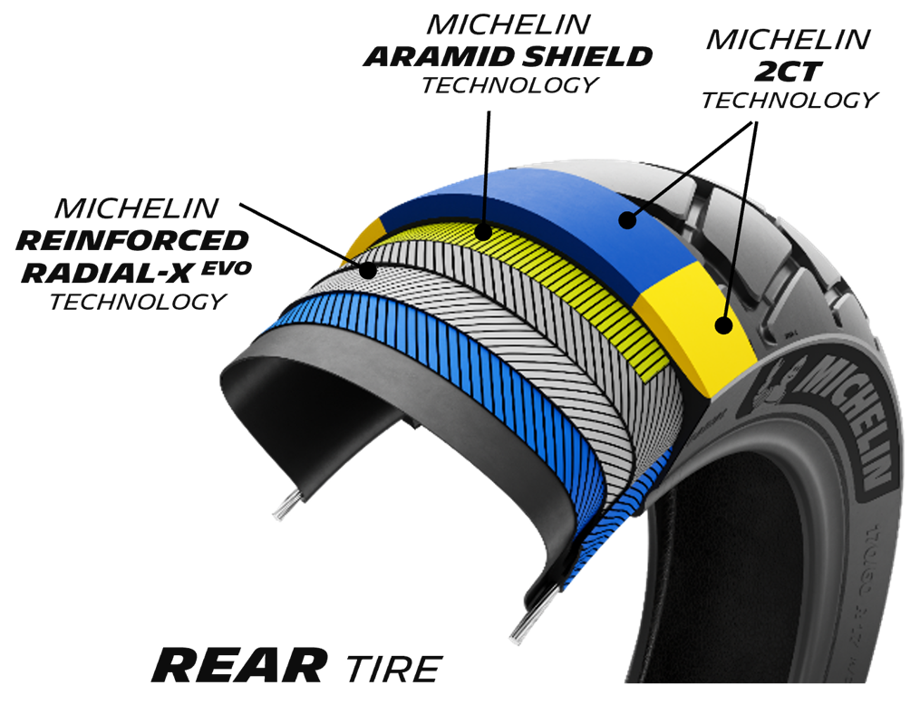 「MICHELIN ANAKEE ADVENTURE 2」は、オフロードでの優れた性能を維持しながら、ウェット路面でのグリップ力が前モデルと比べて10%向上し、さらに中央部の長寿命設計により、耐久性も14%アップしました。また最適化されたトレッドパターンを採用したことで、タイヤから発生する車外音も大幅に削減され、長距離ツーリングでもライダーの疲労が軽減されます。天候を問わず安心して走れるよう、トレッド部分に2CTテクノロジー(3)を採用しています。強化された構造によりオフロード走行時にもタイヤの損傷を軽減し、快適なライディングを実現します。
