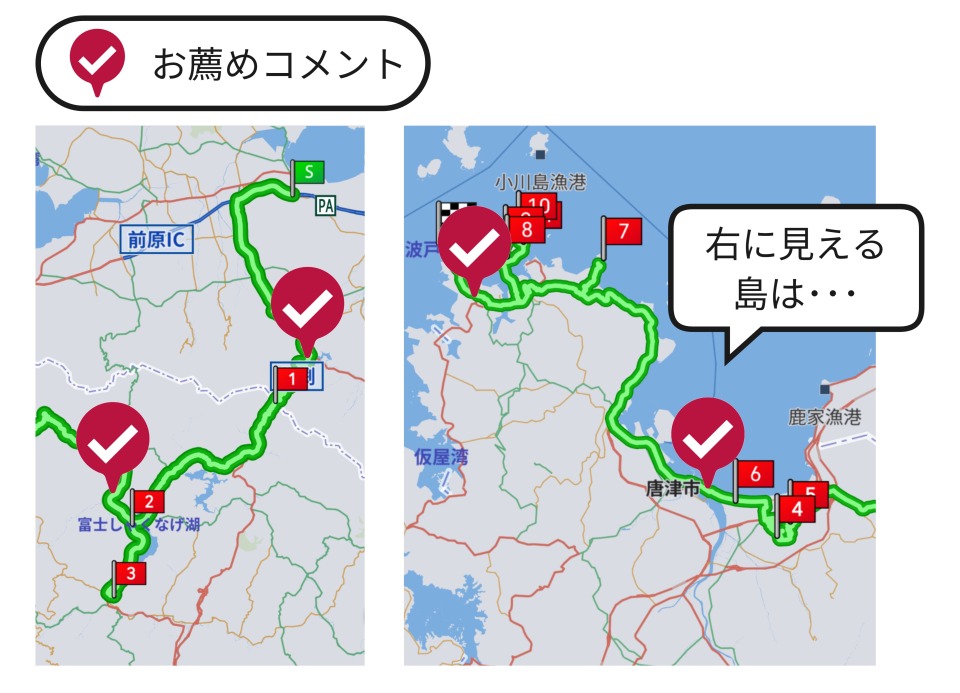 「キュレーターコース」走行中には、景観地点やグルメスポットなどさまざまなお薦めポイントで、ツーリングキュレーターからのコメントが自動発話され、気になるポイントを逃すことなく、快適なツーリングを楽しめます。