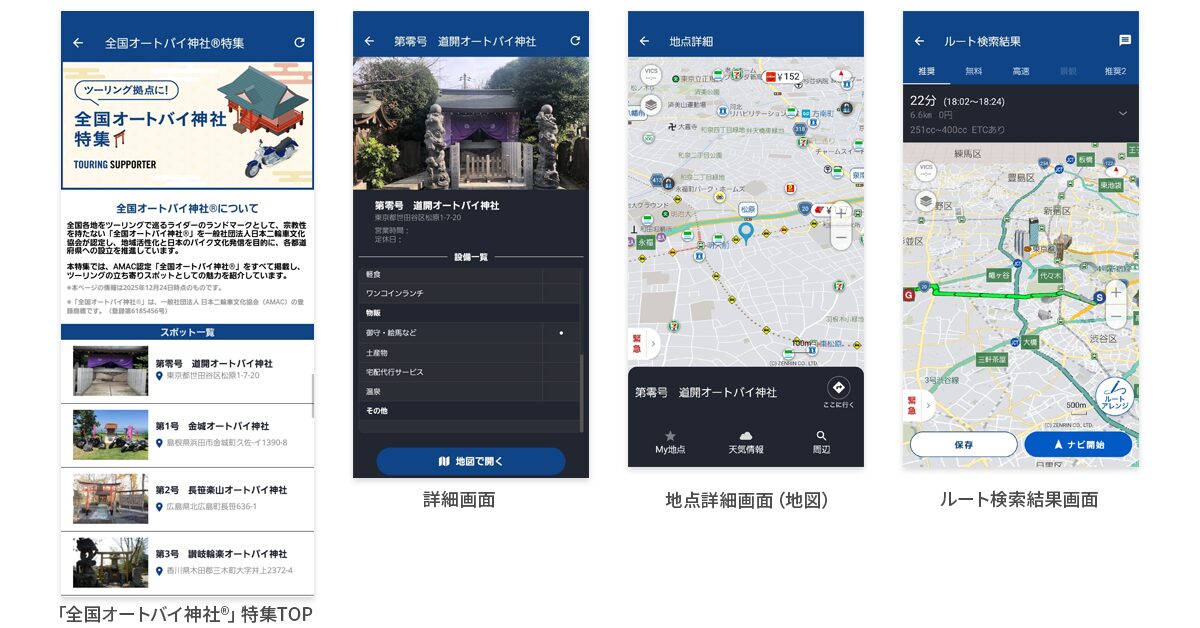 株式会社ナビタイムジャパン(代表取締役社長:大西 啓介、本社:東京都港区)は、2025 年 12 月 26 日(金)より、バイク専用ナビゲーションアプリ『ツーリングサポーター by NAVITIME』において、一般社団法人日本二輪車文化協会が認定する「全国オートバイ神社®」特集を提供開始いたします。二輪向けナビゲーションアプリとして、国内初の公式連携となります。