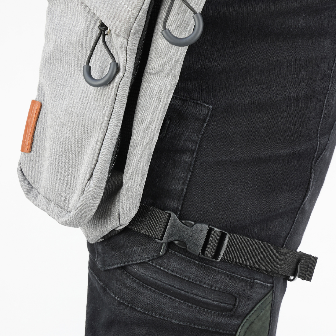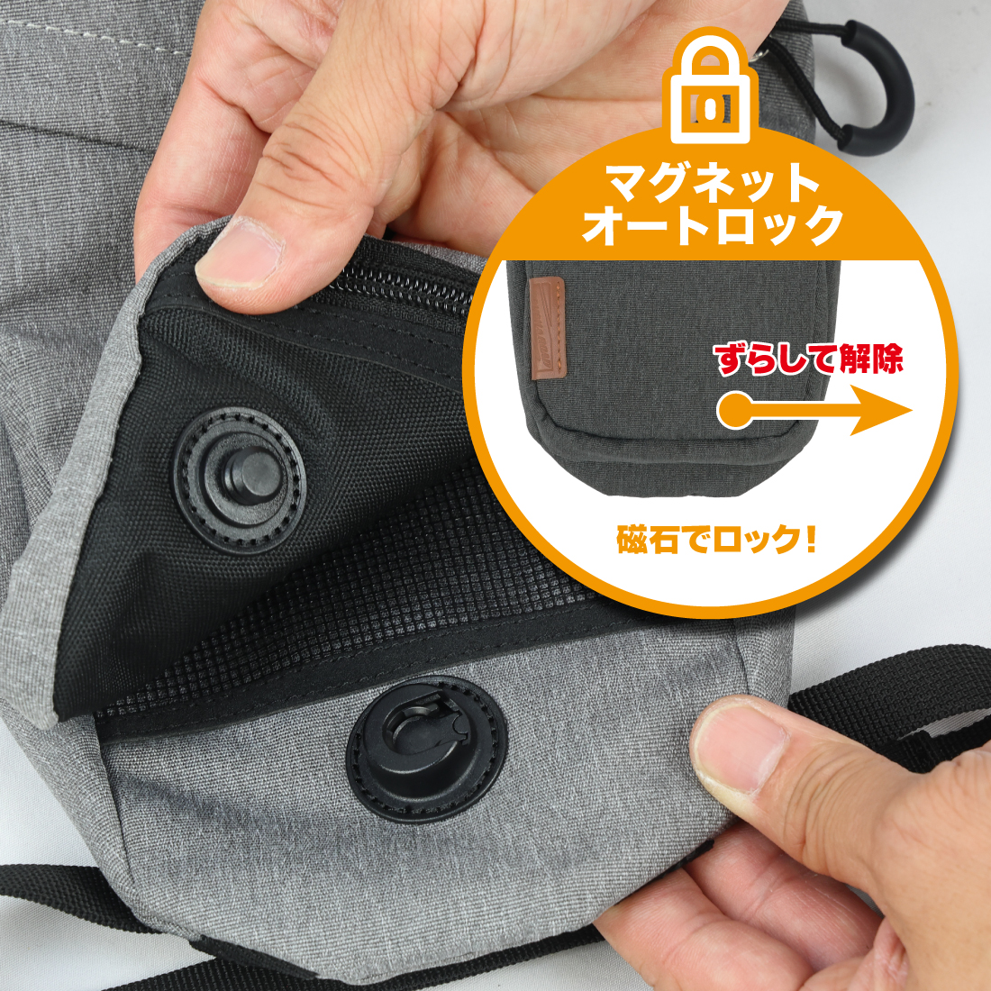 メッシュポケットやキーフック、長財布対応のメインスペースはそのままに、片手で開け閉めできるマグネットオートロックシステムを採用し、サポートベルトは自由度を高める仕様へ改良。さらに多様な使い方に対応したい声にお答えして、パンツのベルトループにカラビナ掛けでも使用できるようDリングを増設、各所ベルトは取り外し可能にしました。左右どちらでも装着可能な両端フレキシブルバックル仕様です。