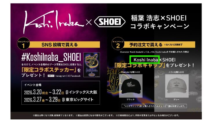 上記イベント会場でのキャンペーン、およびコラボレーションヘルメットの予約注文キャンペーンを実施します。