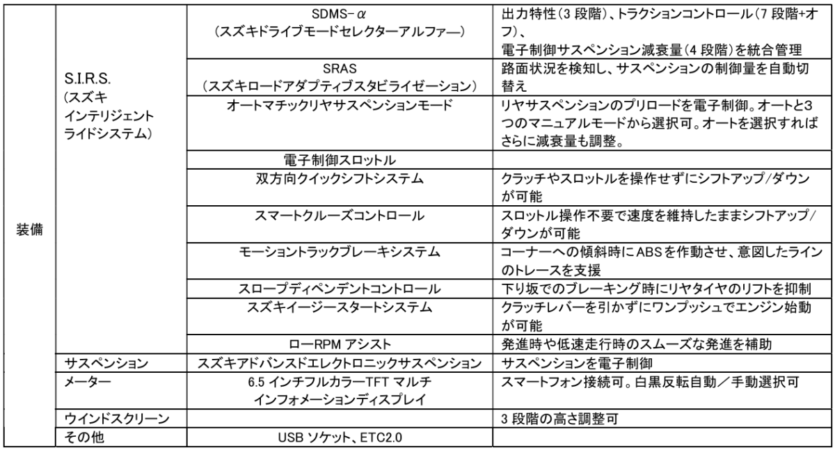 速度や路面状況、ブレーキによる車両の姿勢変化に応じて、サスペンションの減衰量やプリロードを電子制御するスズキアドバンスドエレクトロニックサスペンション(SAES)をスズキの二輪車として初採用。さらにこのSAESに、IMU 等のデータを組み合わせることで、凸凹路面を検知し、サスペンションの制御量を自動で切り替えるスズキの独自プログラム、スズキロードアダプティブスタビライゼーション(SRAS)を開発・搭載しました。