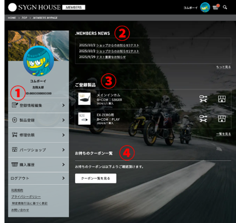 本サービスでは、製品登録、修理依頼、パーツショップ、製品のサポート・お問い合わせの4つのコンテンツを提供します。URLは、https://members.sygnhouse.jp/ です。