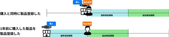 製品購入時の保証期間(1年)を製品登録により、保証期間終了日から最長1年追加される特典です。