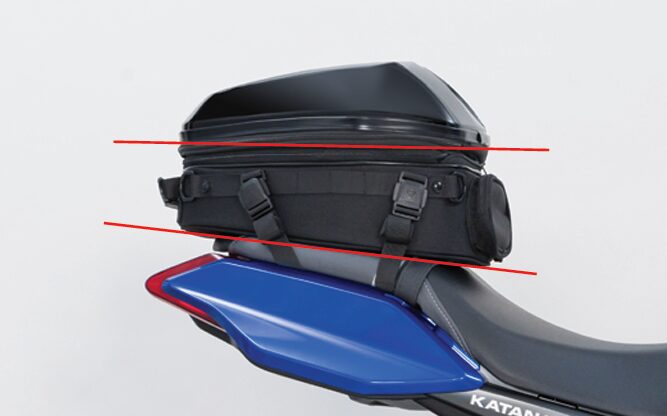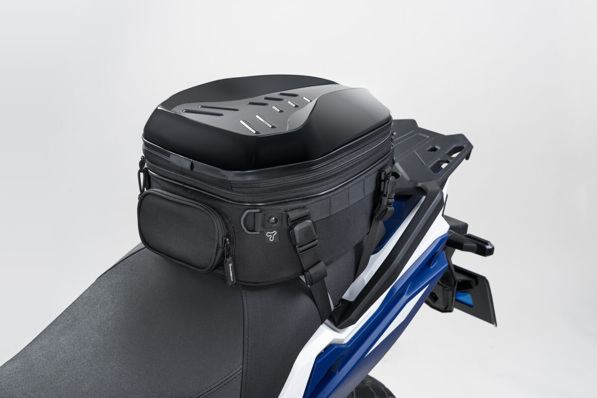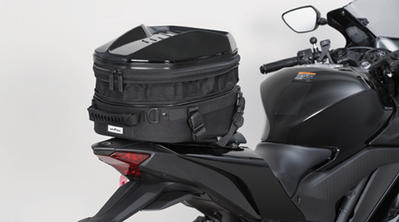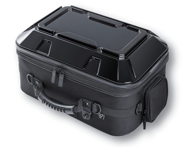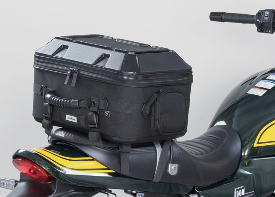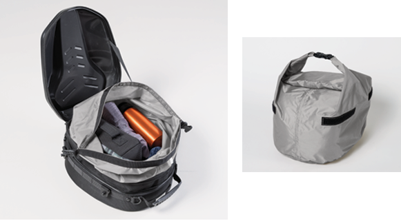 リアシートの限られた積載スペースを最大限活かす、大容量のシートバッグ。少し余裕を持たせた底面形状で広い開口部、上に積むことを考慮した形状のPCシェル、+4ℓの拡張機能と機能満載のツーリング仕様。