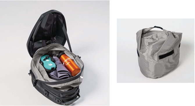 ロールアップ式の防水インナーを付属。雨天時に停車してレインカバーをかける手間を省けます。