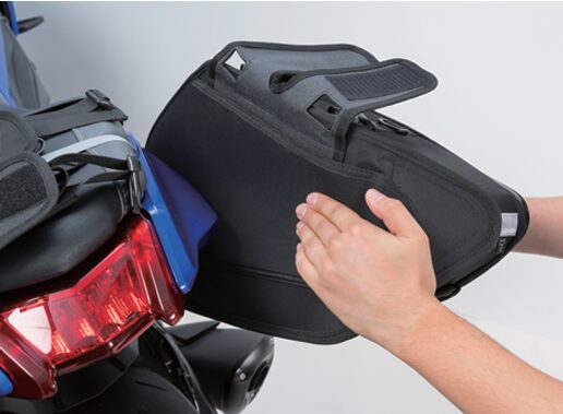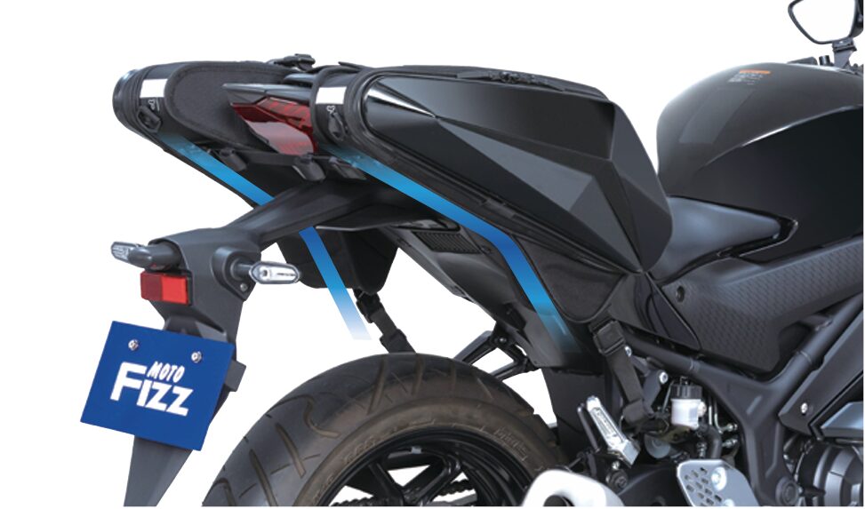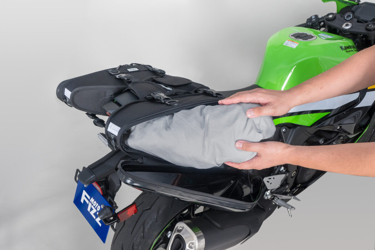 ネオプレン生地がシートカウルの凹凸を吸収し、バッグを車両にぴったりフィットさせます。