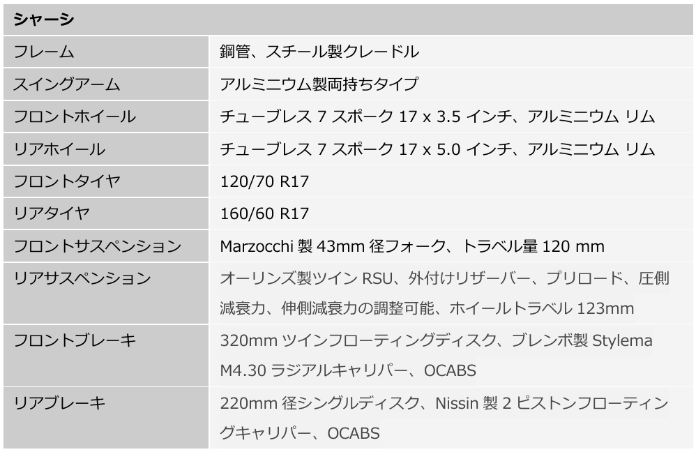 制動力は、320mmディスクに組み合わされたブレンボ製Stylemaツインキャリパーによって発揮されます。さらに、高性能なメッツラー Racetec RR K3タイヤを標準装備し、レバー操作に対してダイレクトで一貫したタッチを備えた、安心感の高いブレーキング性能を実現しています。