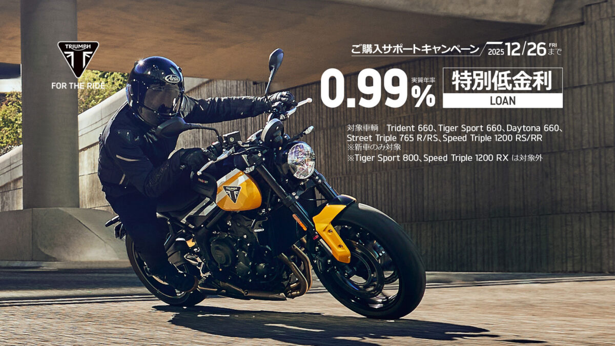 内容:キャンペーン期間中、全国のトライアンフ正規販売店にて対象車両をご成約、且つローン契約を完了していただいたお客様に、「0.99% 特別金利ローン」をご提供します。