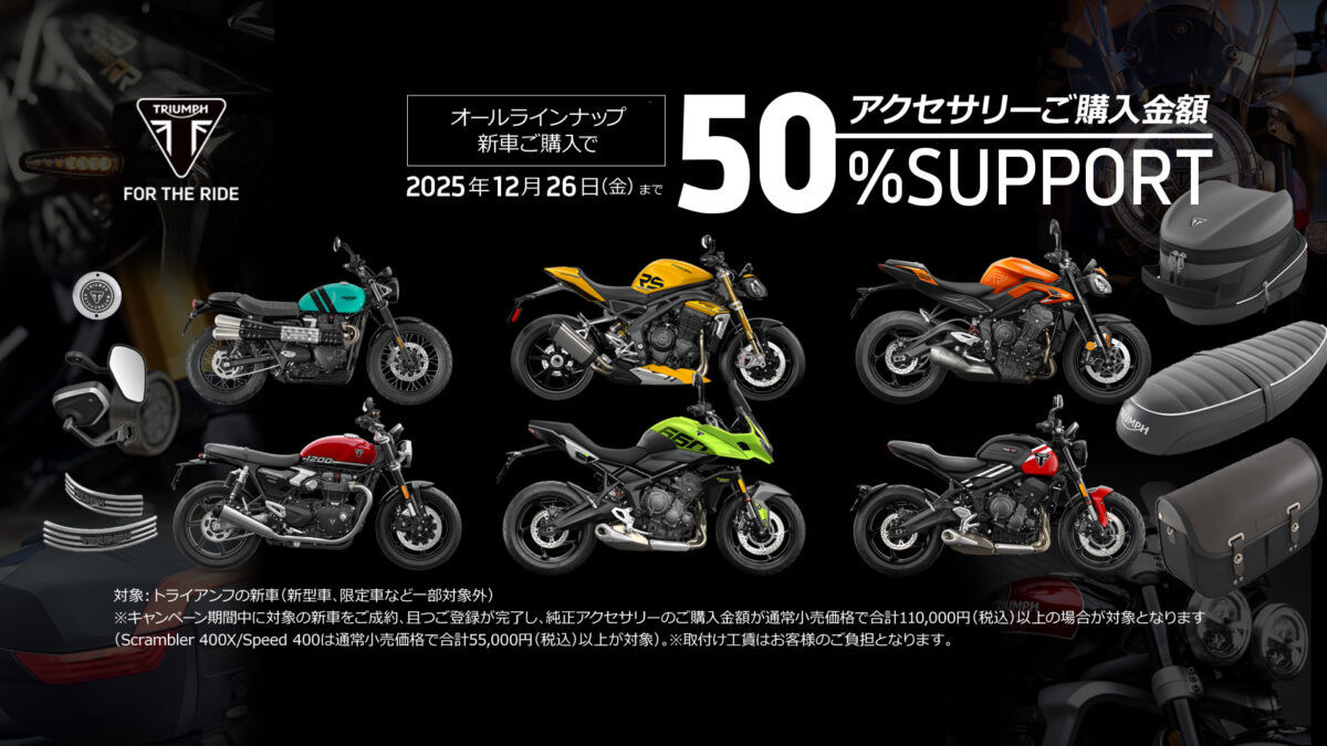 内容:キャンペーン期間中、全国のトライアンフ正規販売店にて新車ご購入の注文時に、ご購入車両に適用の車体アクセサリー類を一緒にオーダーすると、アクセサリー類の通常希望小売価格から50%オフで新車にアクセサリーパーツを取り付けることが可能となります。