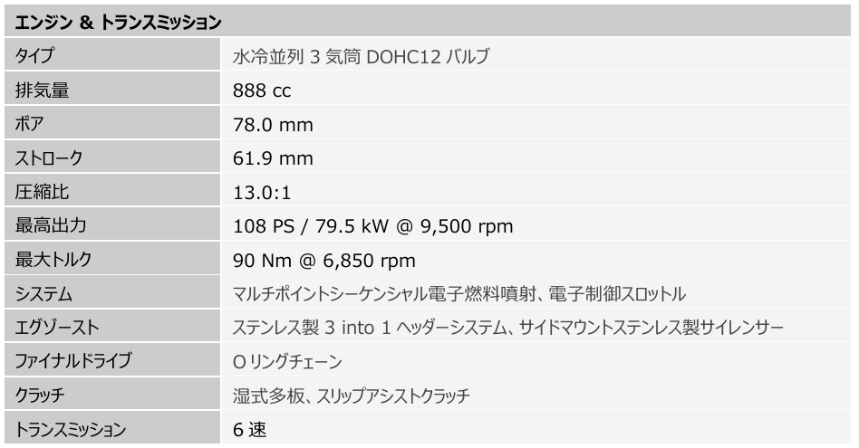 888cc トリプルエンジンを搭載し、9,500rpmで108PS、6,850rpmで90Nmのトルクを発揮。レスポンスに優れたパワーデリバリーと高い燃焼効率、さらにEuro 5+ 規制適合により、長距離ツーリングからテクニカルなオフロード走行まで幅広く対応。パフォーマンスと実用性を理想的なバランスで融合したモデルです。