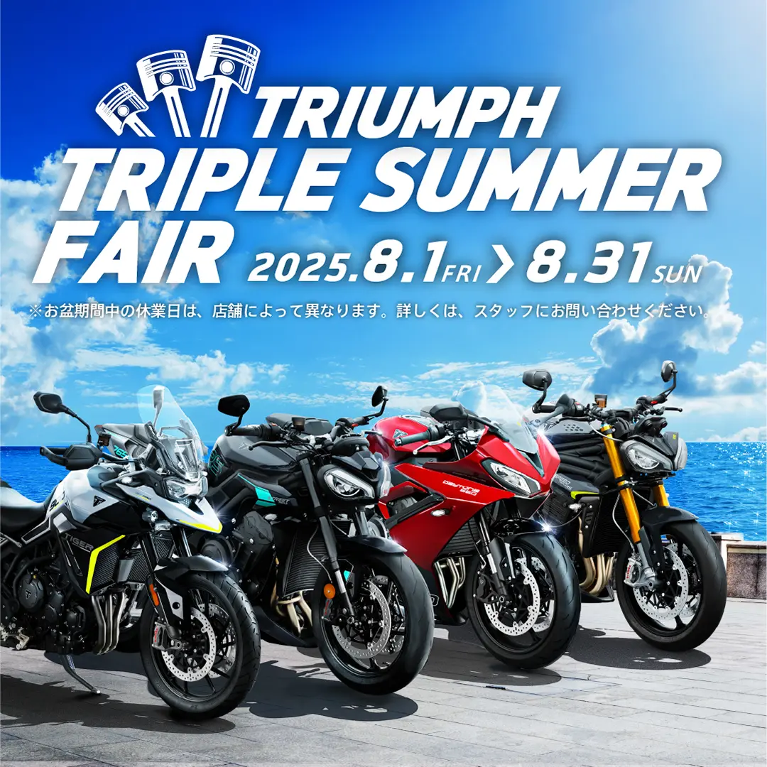 トライアンフモーターサイクルズジャパン株式会社(本社:東京都港区海岸 代表取締役社長:大貫陽介)は、8月1日(金)~8月31日(日)までの期間中、全国のトライアンフ正規販売店にて、トライアンフの代名詞とも言えるトリプルエンジン搭載モデルにフォーカスした「TRIPLE SUMMER FAIR」を開催する事をお伝えします。