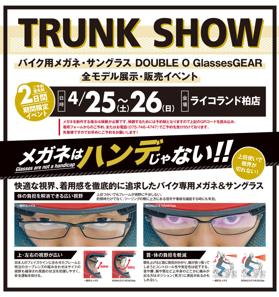 ダブルオーグラスギアは、バイク用メガネが体感できるイベント「TRUNK SHOW」を2026年4月25日(土)~26日(日)に、ライコランド柏店で開催すると発表した。