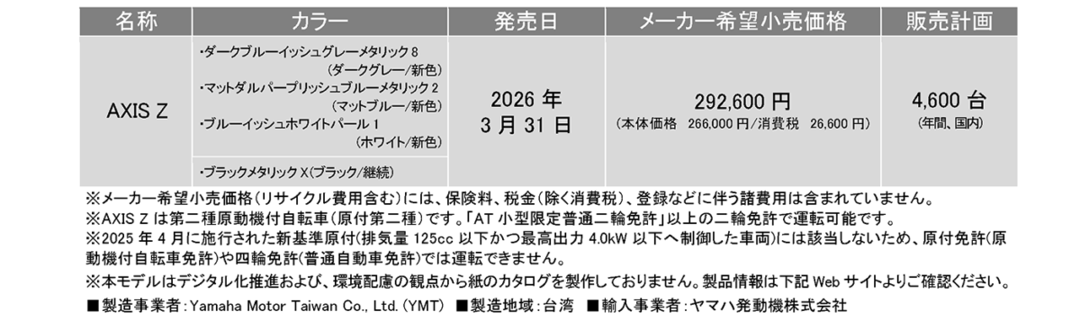 ヤマハ発動機販売株式会社は、“BLUE CORE”エンジンを搭載する原付二種スクーター「AXIS Z」の新色3色を2026年3月31日に発売すると発表した。