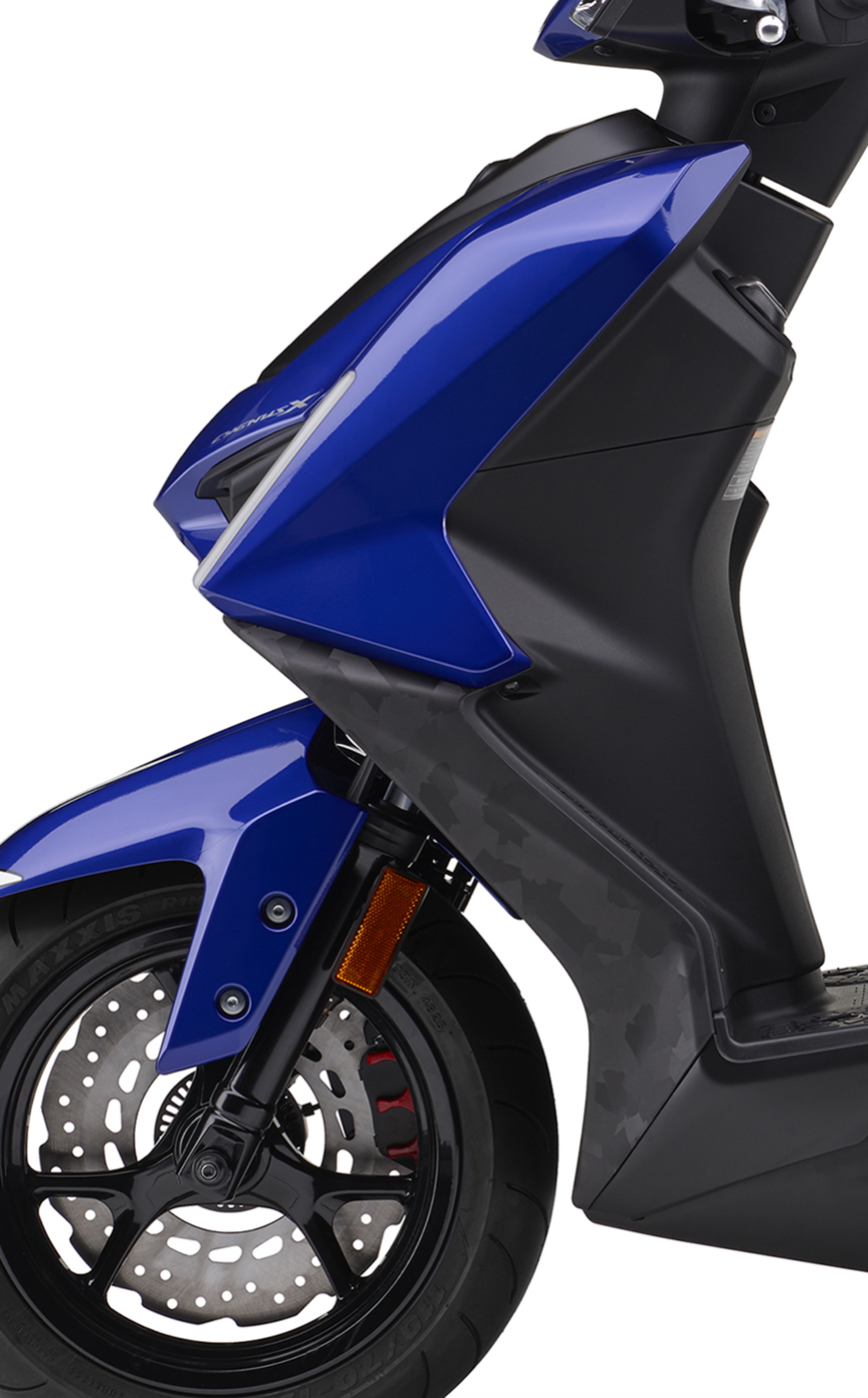 また、軽快な操縦性を引き出すため、フロントタイヤサイズを「CYGNUS GRYPHUS」の120/70-12から110/70-12へ変更し、同時にリム幅も2.75インチから2.5インチへとスリム化しました。