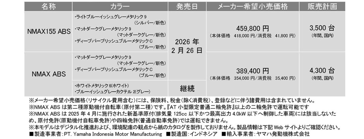 ヤマハ発動機販売株式会社は、水冷エンジンを搭載したスクーター「NMAX155 ABS」および「NMAX ABS」に新たなカラーバリエーションを追加し、2026年2月26日より発売する。