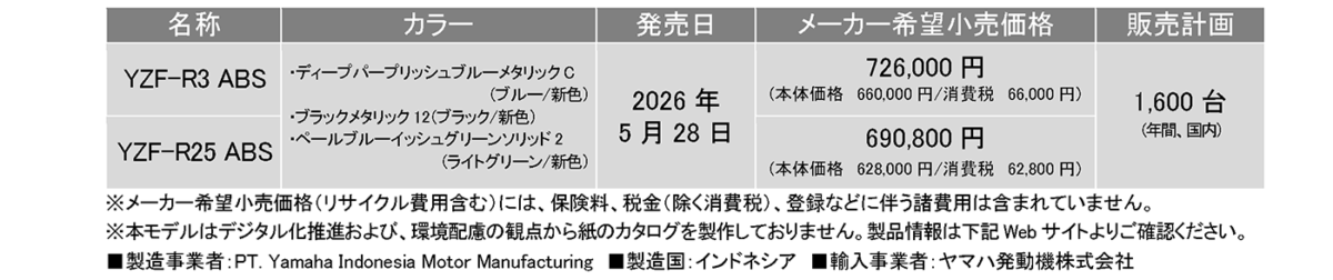 ヤマハ発動機販売株式会社は、スーパースポーツモデル「YZF-R3 ABS」および「YZF-R25 ABS」の新色を2026年5月28日に発売すると発表した。