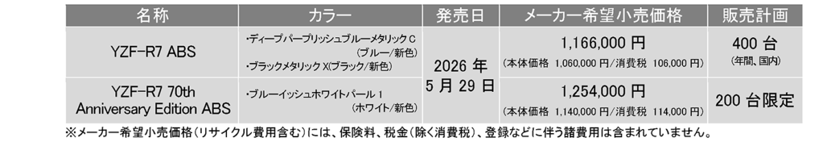 ヤマハ発動機販売株式会社は、水冷並列2気筒688ccエンジンを搭載するスーパースポーツ「YZF-R7 ABS」をモデルチェンジし、2026年5月29日に発売すると発表した。