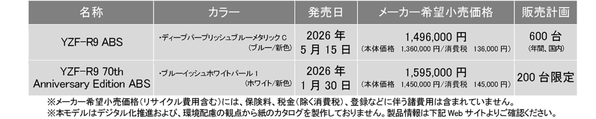スーパースポーツ「YZF-R9 ABS」新色を発売~200台限定で70th Anniversary Editionも発売~